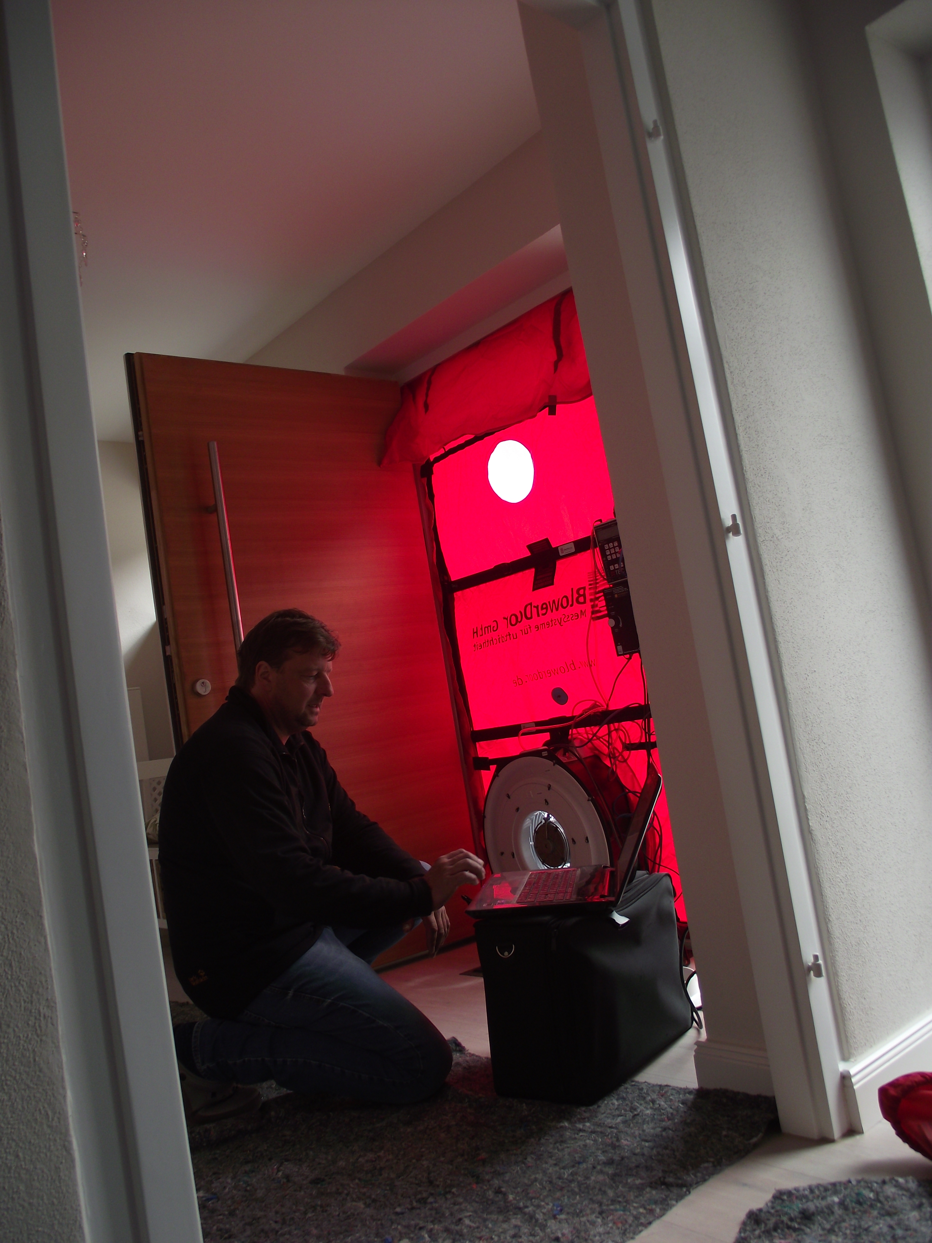 MessverfahrenDas Gebäude wird durch den Einsatz eines Gebläses das in einem Spannrahmen mit einem luftdichtem Tuch eingebaut wird in Unter- oder Überdruck versetzt. Durch den entstehenden Druckunterschied zwischen Innenraum und Außenbereich strömt nun Luft durch Leckagen oder Fugen in das Gebäude. Durch diesen Vorgang können Undichtigkeiten oder Leckagen an der luftdichten Gebäudehülle festgestellt werden. Zur Ermittlung des geforderten n50-Wertes für Wohngebäude muß ein Differenzdruck zwischen Innen- und Außenluft von mindestens 50 Pascal erreicht werden. Die einzelnen Grenzwerte für die Luftwechselrate nach EnEV dürfen dabei nicht überschritten werden. Für das Messergebniss wird dann ein Prüfbericht mit Gutachterzertifikat erstellt. | MF Bautechnik